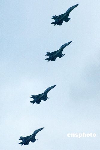 八月二十四日,“和平使命—2005”中俄聯(lián)合軍事演習第三階段兩棲登陸作戰(zhàn)實兵演練在山東半島展開。圖為參加兩棲登陸作戰(zhàn)實兵演練的中國空軍殲擊機四機編隊飛臨演習地域上空。作者:王麗南