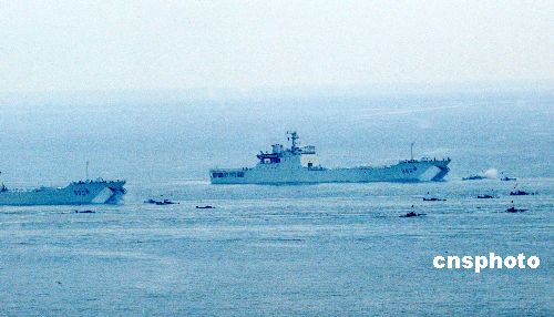 八月二十四日,“和平使命—2005”中俄聯(lián)合軍事演習(xí)第三階段兩棲登陸作戰(zhàn)實(shí)兵演練在山東半島展開(kāi),參加兩棲登陸作戰(zhàn)實(shí)兵演練的中俄海軍陸戰(zhàn)隊(duì)水陸坦克從登陸艇下載后向岸邊突擊。作者:王麗南