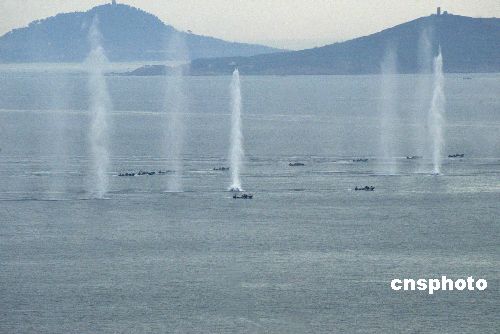 八月二十四日,“和平使命—2005”中俄聯(lián)合軍事演習(xí)第三階段兩棲登陸作戰(zhàn)實兵演練在山東半島展開。圖為陸戰(zhàn)隊搶灘登陸時,受到來自敵方的炮火襲擊。作者:王麗南