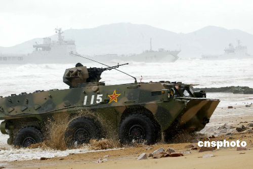 八月二十四日,盡管山東半島天氣惡劣“和平使命—2005”中俄聯(lián)合軍事演習(xí)兩棲登陸作戰(zhàn)實兵演練如期進行。圖為參加兩棲登陸作戰(zhàn)演練的裝甲車搶灘登陸。作者:王麗南
