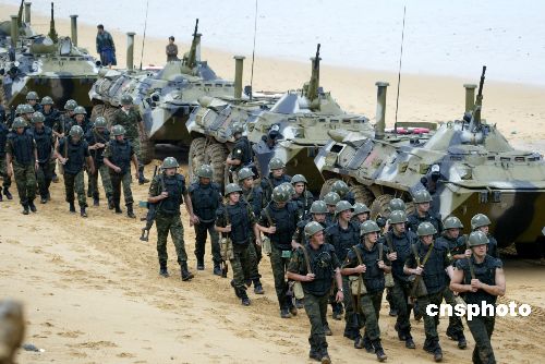 八月二十四日,山東半島雨水不斷,“和平使命—2005”中俄聯(lián)合軍事演習(xí)兩棲登陸作戰(zhàn)實(shí)兵演練如期進(jìn)行。圖為完成登陸任務(wù)后的俄羅斯陸戰(zhàn)隊(duì)員,在海邊等待裝船返航。作者:王麗南