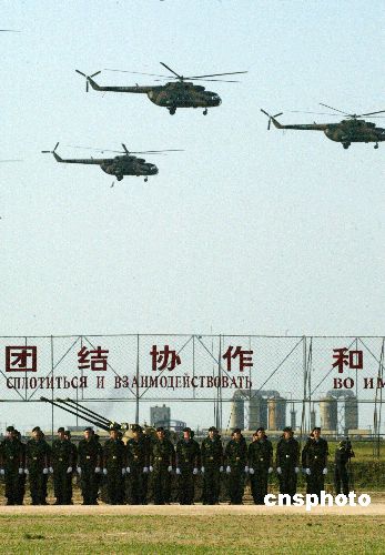 “和平使命-2005”中俄聯合軍事演習8月25日下午在山東濰北地區(qū)結束。在當日舉行的閱兵式上,中方直升機編隊在演習結束后接受檢閱。作者:王麗南