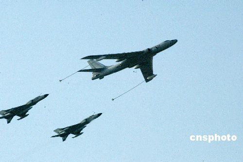 “和平使命-2005”中俄聯(lián)合軍事演習(xí)8月25日下午在山東濰北地區(qū)結(jié)束。在當(dāng)日舉行的閱兵式上,中國(guó)空中加油機(jī)編隊(duì)模擬空中加油。作者:王麗南