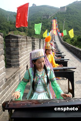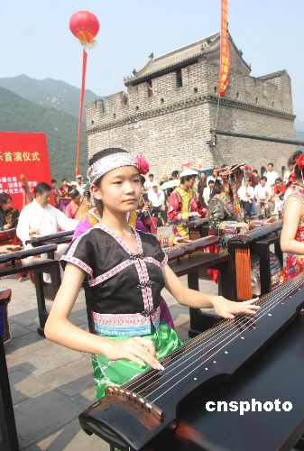 八月二十六日,居庸關長城琴聲悠揚,身著56個民族盛裝的古琴演奏者,在天下第一雄關用鐫刻著56個民族歷史文化和風情習俗的56把極品古琴演奏了《梅花三弄》、《流水》、《關山月》《歌唱祖國》等千古名曲和時代新歌,慶祝中華人民共和國建國56周年。張勤