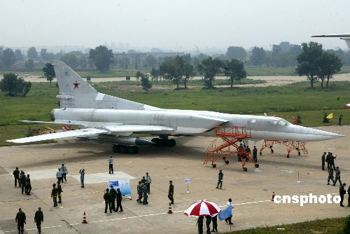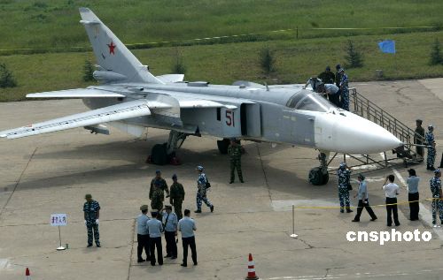 中新網(wǎng)8月26日電 26日上午,參加“和平使命-2005”中俄聯(lián)合軍事演習的俄羅斯空軍裝備在青島流亭機場進行展示。中共中央政治局委員、中央軍委副主席、國務委員兼國防部長曹剛川觀看展覽。