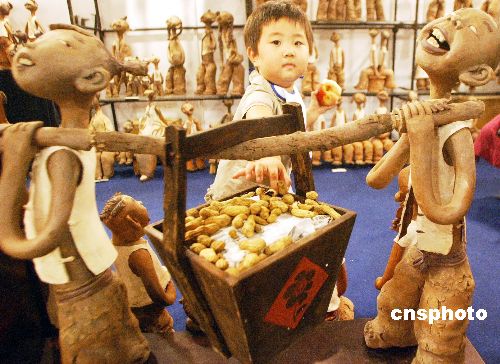 | 八月二十八日,正在北京舉行的“2005中國(guó)藝術(shù)博覽會(huì)”上,匯集了來自中國(guó)各地的百家藝術(shù)品經(jīng)營(yíng)機(jī)構(gòu)和五百名中外藝術(shù)家,在參展的作品中別具特色中國(guó)陶藝藝術(shù)品引人注目。圖為由中央美術(shù)學(xué)院藝術(shù)研究院的鄭玉奎創(chuàng)作的陶藝作品《農(nóng)家樂》充滿濃厚的鄉(xiāng)土氣息,造型活潑、生動(dòng)感人。作者:錢興強(qiáng)