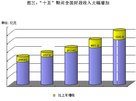 2005年是“十五”計(jì)劃的最后一年;仡欉^去的五年,國家財(cái)政面貌發(fā)生了新的變化,主要是:國家財(cái)政實(shí)力不斷壯大。全國財(cái)政收入連續(xù)突破2萬億元、2.5萬億元和3萬億元大關(guān)。“十五”時(shí)期全國財(cái)政收入為11.5萬億元,比“九五”時(shí)期增加6.4萬億元,增長126.5%,其中中央財(cái)政本級(jí)收入增長141.5%,地方財(cái)政本級(jí)收入增長111.3%!笆濉蹦2005年全國財(cái)政收入占GDP比重為17.3%,比“九五”末2000年的13.5%上升了3.8個(gè)百分點(diǎn)。全國財(cái)政支出為12.8萬億元,比“九五”時(shí)期增加7.1萬億元,增長124%,其中中央財(cái)政本級(jí)支出增長109.5%,地方財(cái)政本級(jí)支出增長130.5%。財(cái)政收入增長的穩(wěn)定性和協(xié)調(diào)性進(jìn)一步增強(qiáng),財(cái)政發(fā)展的步伐不斷加快。財(cái)政宏觀調(diào)控作用不斷增強(qiáng)。根據(jù)經(jīng)濟(jì)發(fā)展的客觀需要,相機(jī)調(diào)整并順利實(shí)現(xiàn)了積極財(cái)政政策向穩(wěn)健財(cái)政政策的轉(zhuǎn)變,促進(jìn)了經(jīng)濟(jì)保持平穩(wěn)較快發(fā)展。在認(rèn)真總結(jié)財(cái)政政策實(shí)踐的基礎(chǔ)上,建立健全了基本適應(yīng)通貨膨脹、通貨緊縮、供求總量基本平衡但結(jié)構(gòu)不均衡等不同經(jīng)濟(jì)運(yùn)行形態(tài)需要的,包括目標(biāo)定位、政策組合、時(shí)機(jī)選擇、組織實(shí)施等一系列要素在內(nèi)的財(cái)政宏觀調(diào)控體系。以人為本的公共支出體系不斷完善。按照科學(xué)發(fā)展觀和社會(huì)主義市場(chǎng)經(jīng)濟(jì)發(fā)展的要求,大力調(diào)整和優(yōu)化支出結(jié)構(gòu),不斷減少并逐步退出對(duì)一般競(jìng)爭(zhēng)性、經(jīng)營性領(lǐng)域的財(cái)政投入;大力支持義務(wù)教育、就業(yè)和社會(huì)保障、公共衛(wèi)生等公益性社會(huì)事業(yè)的改革和發(fā)展;向困難地區(qū)、行業(yè)和群眾傾斜,注意解決事關(guān)人民群眾切身利益的突出矛盾和問題,把實(shí)現(xiàn)好、維護(hù)好、發(fā)展好最廣大人民群眾的根本利益作為財(cái)政支出的出發(fā)點(diǎn)和落腳點(diǎn)。公共財(cái)政管理體制改革不斷深化。積極推進(jìn)出口退稅機(jī)制改革、增值稅轉(zhuǎn)型、個(gè)人所得稅及所得稅收入分享改革,深化預(yù)算管理制度改革,支持其他方面經(jīng)濟(jì)體制改革;推動(dòng)財(cái)政法制建設(shè)、加強(qiáng)會(huì)計(jì)基礎(chǔ)工作、轉(zhuǎn)變財(cái)政監(jiān)督方式,進(jìn)一步健全了公共財(cái)政管理框架。