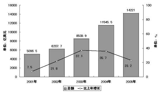 圖表五 “十五”期間外貿(mào)進出口總額及其增長情況