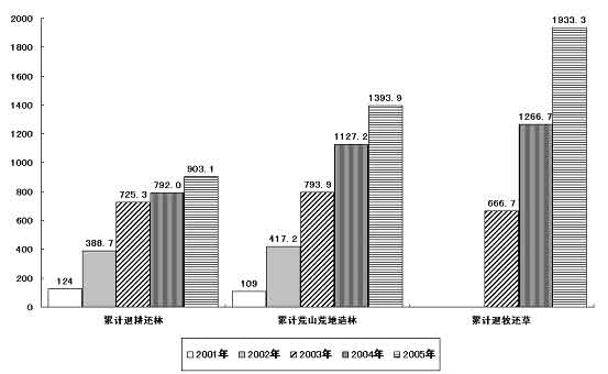 “三河三湖”、三峽庫區(qū)、南水北調(diào)工程沿線等重點流域區(qū)域水污染防治工作步伐加快,城鎮(zhèn)污水、工業(yè)廢水、危險廢物、火電廠二氧化硫污染治理進一步加強。城市污水處理率和工業(yè)固體廢物綜合利用率繼續(xù)提高。部分空氣污染嚴重城市的空氣質(zhì)量有所改善。退耕還林完成111.1萬公頃,荒山荒地造林及封山育林266.7萬公頃,退牧還草666.7萬公頃。天然林資源保護、京津風沙源治理等重點生態(tài)建設(shè)工程進展順利!叭辈莸刂卫怼⑺亮魇е卫砗偷V山生態(tài)恢復面積分別為838萬公頃、420萬公頃和7.2萬公頃。野生動植物資源保護得到加強。