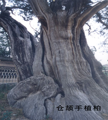 “倉(cāng)頡手植柏”是廟內(nèi)最古老的柏樹(shù)。此柏腰圍7.28米,根圍9.3米,高17米,林業(yè)專家斷定它足有五千年樹(shù)齡。它完全可以同“黃帝手植柏”相媲美。相傳當(dāng)年倉(cāng)頡選中這個(gè)墓穴后,便在此處栽植了這棵柏樹(shù),所以叫“倉(cāng)頡手植柏”。