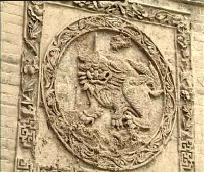照壁中間的磚雕為一獨角猛獸,稱之為獨角獸,又名“廌”(音制),倉頡造“法”字便是根據(jù)獨角獸而造的,古代法字寫為“
