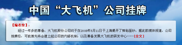 | “中國的汽車、遠(yuǎn)洋貨輪、載人航天都有自己的品牌產(chǎn)品,而中國大飛機(jī)卻至今沒有,作為航空人,我感到很慚愧!毙氯稳珖䥇f(xié)委員、中國航空工業(yè)第一集團(tuán)公司第一飛機(jī)設(shè)計研究院院長吳光輝接受中新社記者專訪,對中國大飛機(jī)的研制感觸頗深……<詳細(xì)> |