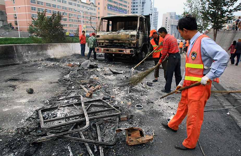 7月6日,烏魯木齊市的工作人員在清理被犯罪分子焚燒的汽車。在5日晚發(fā)生的嚴重暴力犯罪事件中,被毀車輛達260部;受損門面房203間,民房14間,總過火面積達到56850平方米,全市共有220多處縱火點,有兩棟樓房被燒毀。中新社發(fā) 劉新 攝