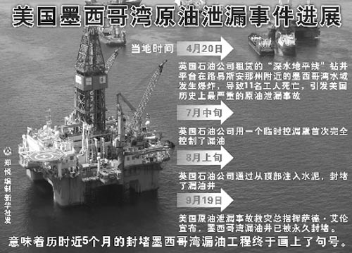 美國(guó)墨西哥灣原油泄漏事件救災(zāi)總指揮艾倫9月19日宣布,美國(guó)內(nèi)政部海洋能源管理局已經(jīng)確認(rèn),17日起從一口新鉆出的減壓井灌入漏油井底部的水泥已經(jīng)凝固并通過(guò)了壓力測(cè)試!艾F(xiàn)在我們終于可以說(shuō),發(fā)生泄漏的MC252油井已被有效封死,今后不會(huì)再對(duì)墨西哥灣造成任何危害!泵绹(guó)救災(zāi)現(xiàn)場(chǎng)指揮、海岸警衛(wèi)隊(duì)少將保羅·楚孔夫特表示,盡管漏油井已被封死,但清理墨西哥灣泄漏原油的工作遠(yuǎn)未結(jié)束。肇事的英國(guó)石油公司19日發(fā)布一份新聞公報(bào)說(shuō),該公司為應(yīng)對(duì)墨西哥灣漏油事故已支出約95億美元。這一數(shù)字包括應(yīng)對(duì)泄漏的費(fèi)用、減壓井鉆探費(fèi)用、靜滅法費(fèi)用、對(duì)墨西哥灣沿海各地的補(bǔ)貼和賠償金等。