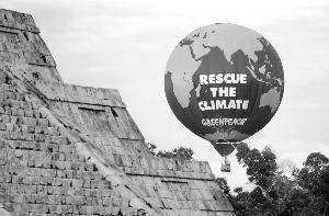 28日,在墨西哥坎昆的奇琴伊查瑪雅古城遺址旁,綠色和平組織升起一個巨大的熱氣球,呼吁人們保護環(huán)境 新華社圖