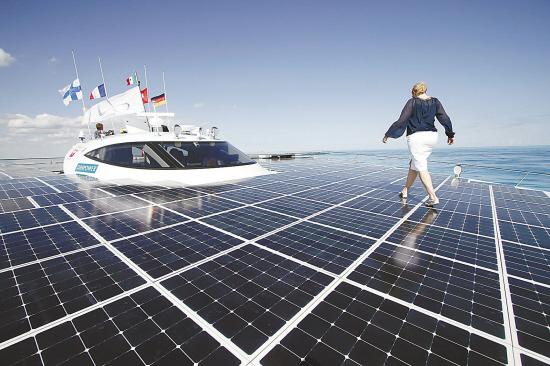 12月8日,在墨西哥坎昆,一名婦女行走在以太陽能為動力的“星球陽光”號雙體船的甲板上!靶乔蜿柟狻遍L31米、寬15米,被制造商稱為世界上最大的太陽能動力船。 新華社發(fā)