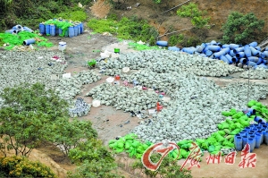 近日,有熱心讀者致電廣州日報稱一個地下金屬回收廠藏身于布吉南灣一處山坳里,留意觀察才發(fā)現(xiàn)里面的人用明火和強酸提煉各種金屬,近百桶裝滿各種腐蝕性、強酸性的化學品就堆放在一個雨棚下面,對周邊環(huán)境危害很大。1月25日上午,記者驅(qū)車從吉廈工業(yè)園內(nèi)經(jīng)過一段崎嶇不平的山路,才在一處山坳里找到這處極其隱蔽的地下金屬回收廠。