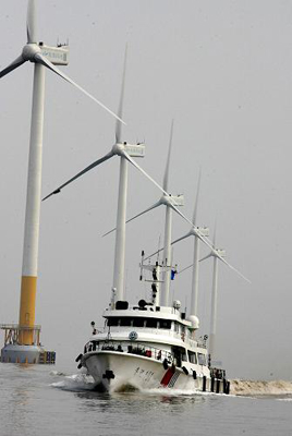2月22日,上海海事局洋山海事處的巡邏艇正在安裝了風(fēng)力發(fā)電機(jī)的海域巡視。上海東海大橋100兆瓦海上風(fēng)力發(fā)電示范工程,是我國第一個(gè)由國家發(fā)改委正式核準(zhǔn)并列為示范項(xiàng)目的大型海上風(fēng)電項(xiàng)目,也是亞洲首座海上風(fēng)力發(fā)電場,目前海上34臺(tái)風(fēng)機(jī)安裝已進(jìn)入尾聲,預(yù)計(jì)于今年5月1日前并網(wǎng)發(fā)電。