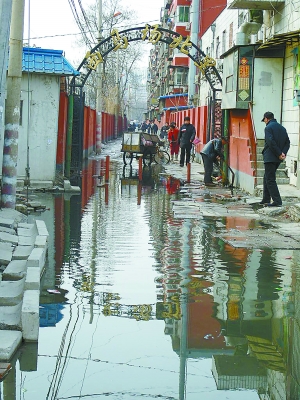 據(jù)居民介紹,西馬場北里只有這一條東西走向的胡同,居民出門、購物都必須走這條路。可現(xiàn)在路面每天汩汩往外冒臭水,人們只好用方磚沿著胡同北面鋪了一條窄路勉強通行,而現(xiàn)在那些方磚也被臭水淹沒了,居民通行更加困難。