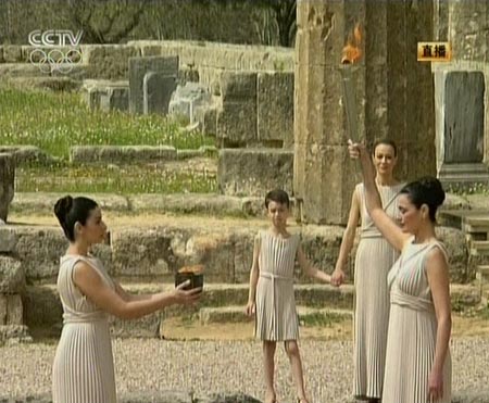 十二時十二分,最高女祭司在古奧林匹克競技場入口處點(diǎn)燃第一名火炬手、曾獲雅典奧運(yùn)銀牌的希臘跆拳道運(yùn)動員亞歷山大·尼克拉澤斯手中的火炬,同時將橄欖枝傳遞給他。亞歷山大舉起第一支燃燒的“祥云”火炬,開啟了北京奧運(yùn)“點(diǎn)燃激情、傳遞夢想”的火炬?zhèn)鬟f旅程。