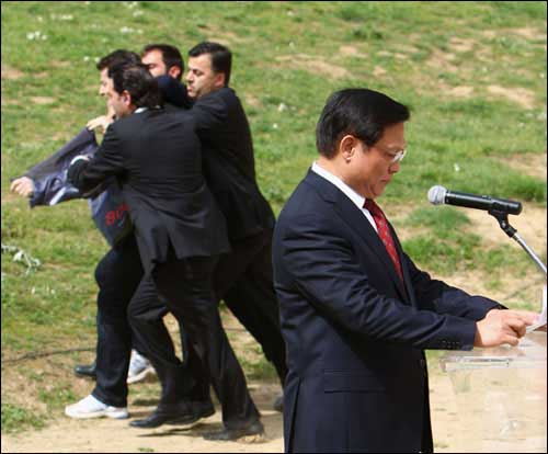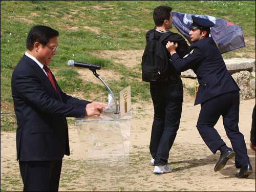 上午十一點(diǎn),圣火采集儀式正式開(kāi)始。陽(yáng)光明媚,暖風(fēng)習(xí)習(xí),古競(jìng)技場(chǎng)內(nèi)綠草茵茵,春花爛漫,一切都顯得生機(jī)盎然,現(xiàn)場(chǎng)氣氛神圣而祥和。儀式進(jìn)行了十幾分鐘,北京奧組委主席劉淇上前開(kāi)始發(fā)表講話,這時(shí),記者看見(jiàn)來(lái)賓席上突然躥出一個(gè)人,他奔向劉淇,在劉淇身旁展開(kāi)一個(gè)橫幅,另有兩個(gè)顯然是他同伙的人也加入進(jìn)來(lái)發(fā)難。但他們迅即被在場(chǎng)的希臘警察制服,并被帶離現(xiàn)場(chǎng)。在這一不到兩分鐘的過(guò)程中,劉淇繼續(xù)沉穩(wěn)莊嚴(yán)地發(fā)表講話,未受到任何影響。當(dāng)劉淇主席講話結(jié)束和會(huì)場(chǎng)傳來(lái)北京奧運(yùn)圣火在赫拉神廟前已點(diǎn)燃的消息時(shí),整個(gè)現(xiàn)場(chǎng)響起了雷鳴般的掌聲,在場(chǎng)的人們用這種方式表達(dá)了對(duì)奧運(yùn)的熱愛(ài)和對(duì)北京奧運(yùn)會(huì)的祝福。整個(gè)儀式按既定程序進(jìn)行,那場(chǎng)小鬧劇也成了全世界愛(ài)好和平、熱愛(ài)奧運(yùn)的人們的笑柄。
