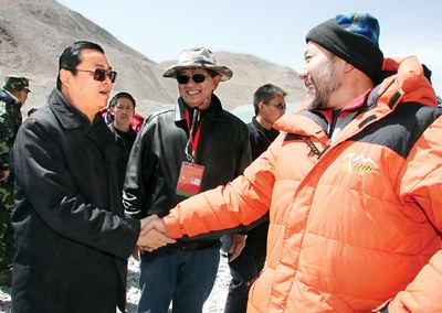 3月30日,在日喀則檢查指導維護穩(wěn)定和邊境管理工作的自治區(qū)黨委副書記、自治區(qū)常務副主席郝鵬,公安部副部長張新楓,帶領工作組一行專程前往珠峰大本營,檢查北京奧運會火炬登頂珠峰的安全保障工作情況。