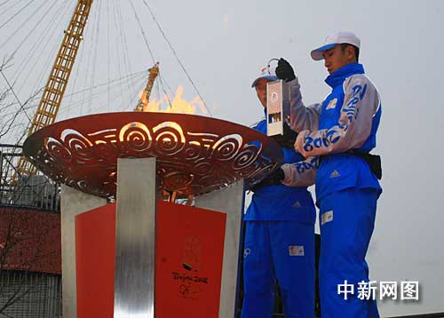 奧運(yùn)圣火從圣火盆引回火種燈