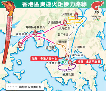 奧運(yùn)圣火本月30日抵港,配合5月2日的圣火傳送,特區(qū)政府修訂原先33公里的傳送路線,并于18日進(jìn)行測(cè)試。在擬定的路線,圣火會(huì)以跑步、車輛、龍船和渡輪接力傳送,當(dāng)天上午10時(shí)半以文化中心作起點(diǎn),至下午約5時(shí)30分抵達(dá)灣仔金紫荊廣場(chǎng)作終點(diǎn),途經(jīng)青馬大橋、維港,以及尖沙咀、沙田、中環(huán)和灣仔的主要道路。