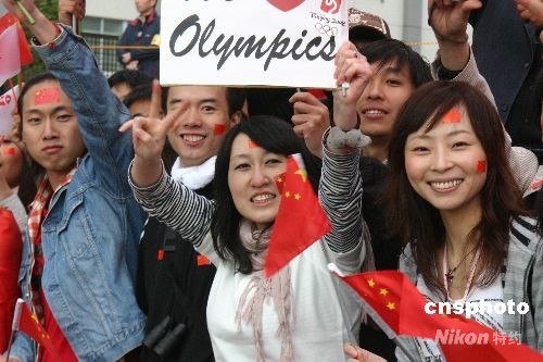 圖為中國(guó)留學(xué)生為北京奧運(yùn)圣火沿街助威。 中新社發(fā) 沈晨 攝