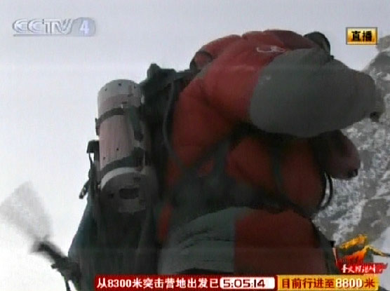 中國登山隊奧運圣火登頂珠峰突擊隊8日凌晨向珠峰峰頂發(fā)起沖擊。圖為電視截圖。