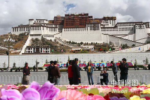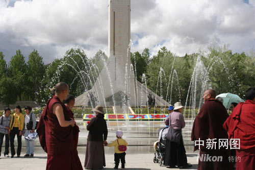 平日只在夜間開(kāi)放的布達(dá)拉宮廣場(chǎng)音樂(lè)噴泉,今日破例在白天開(kāi)放。廣場(chǎng)上用鮮花搭建的“民族大團(tuán)結(jié)、齊心迎奧運(yùn)”等三組奧運(yùn)主題景觀,把不是節(jié)日勝似節(jié)日的廣場(chǎng)裝點(diǎn)得花團(tuán)錦蔟。廣場(chǎng)上西藏和平解放紀(jì)念碑前,幾位紅衣喇嘛正在接受媒體采訪。日前他們?cè)鴮iT舉辦過(guò)“祈愿世界和平、祝福北京奧運(yùn)”主題法會(huì)。年紀(jì)稍長(zhǎng)的一位喇嘛說(shuō)!氨本⿰W運(yùn)會(huì)圣火今天成功在珠峰點(diǎn)燃,激發(fā)了中華民族的自豪感。聽(tīng)說(shuō)珠峰傳遞結(jié)束后,圣火火種將在拉薩與西藏境內(nèi)傳遞的主火種會(huì)合。這又是一次民族團(tuán)結(jié)的象征,必將彰顯示中華民族傳統(tǒng)的‘和合’理念!