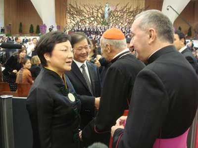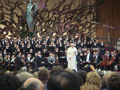 5月7日,中國愛樂樂團及上海歌劇院合唱團聯(lián)袂在梵蒂岡保羅六世音樂大廳舉行了專場演出,傾情演繹莫扎特的《安魂曲》和中國民樂《茉莉花》。演出獲得巨大成功。中方代表團團長、中國愛樂樂團高級顧問鄧榕女士、中國駐意大利大使孫玉璽、使館人員、華僑華人、留學生、中資機構代表以及教皇本篤十六世、梵、意各界近6000人欣賞了演出。