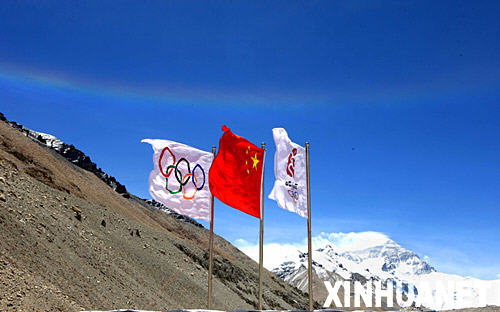 5月8日,北京奧運(yùn)圣火珠峰傳遞登山隊(duì)成功登頂珠穆朗瑪峰。這是登山隊(duì)員在峰頂展示“祥云”火炬、火種燈、中國(guó)國(guó)旗、奧運(yùn)五環(huán)旗和北京奧運(yùn)會(huì)會(huì)徽旗。 中新社發(fā) 阿旺扎西 攝