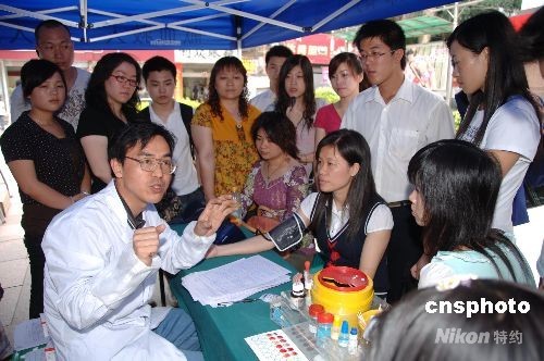 5月14日,福州各獻血屋、流動獻血站人頭攢動,市民們紛紛競相向四川地震災(zāi)區(qū)傷員獻血。這是當(dāng)日午時,福建省血液中心福州東街流動獻血站陳國龍醫(yī)生,一邊為獻血民眾作血檢一邊不厭其煩地向人們講解怎樣“應(yīng)急獻血登記”,以備國家衛(wèi)生部統(tǒng)一調(diào)血安排。 中新社發(fā) 鄭祚聲 攝