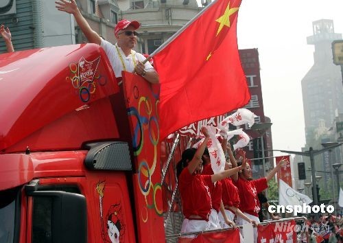 五月二十三日,奧運圣火在上海傳遞,老外在奧運花車上振臂為北京奧運加油。 中新社發(fā) 潘索菲 攝