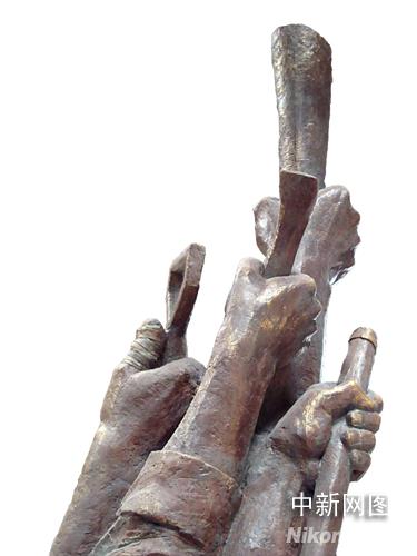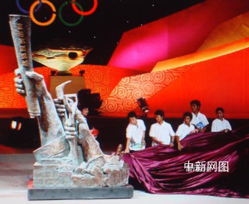中新網(wǎng)北京6月2日電 (記者 賴海隆)5月31日晚,一尊名為“高擎圣火,克難興邦”的“5.12”大型紀(jì)念雕塑出現(xiàn)在“2008奧運(yùn)景觀雕塑方案征集大賽頒獎(jiǎng)活動(dòng)”現(xiàn)場(chǎng)。專程從重災(zāi)區(qū)趕來的十余名北川中學(xué)的幸存者與作者一起共同為此尊雕塑揭幕。這一象征中國人表達(dá)自強(qiáng)不息,重建家園,辦好奧運(yùn)決心的一幕,將現(xiàn)場(chǎng)氣氛推向了高潮。