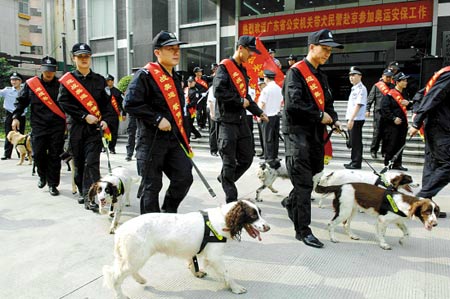 據(jù)悉,此次公安部從全國公安系統(tǒng)選調(diào)204名帶犬民警、204頭搜爆犬參加奧運安保工作,廣東抽調(diào)的數(shù)量最多。目前廣東共有16個地級市公安機關(guān)建立了警犬機構(gòu),擁有警用工作犬769頭,占全國警犬?dāng)?shù)量的1/6。