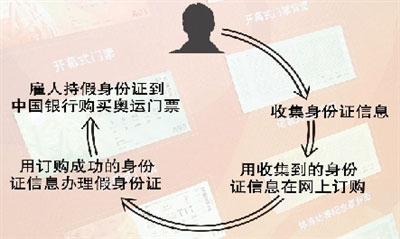 5月13日,在中國(guó)職工之家內(nèi)的中國(guó)銀行,兩名男子持假身份證購買奧運(yùn)門票。警方將兩人帶走審訊后,成功搗毀了一個(gè)搜集身份證信息制造假證,網(wǎng)上訂票后高價(jià)倒賣的團(tuán)伙。該團(tuán)伙的奧運(yùn)發(fā)財(cái)夢(mèng),因假證被識(shí)破而破滅。