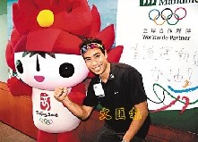 李致和站在京奧吉祥物“歡歡”身旁為自己打氣。 文匯報(bào)記者潘志南 攝