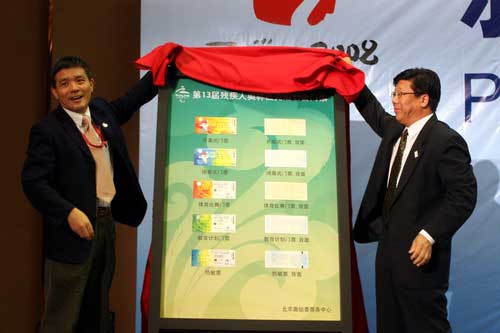 北京奧運(yùn)票務(wù)中心主任朱炎、副主任于喜來(lái)揭曉北京殘奧會(huì)門票票樣。