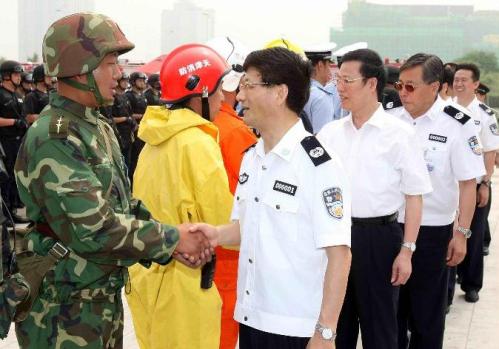 北京奧運安保工作協(xié)調(diào)小組組長、公安部黨委副書記、副部長劉京,國務(wù)院副秘書長汪永清,國家反恐辦主任、公安部黨委委員、副部長孟宏偉和天津市委副書記、市長黃興國等領(lǐng)導(dǎo)一同觀看了演習(xí)。(徐燦)