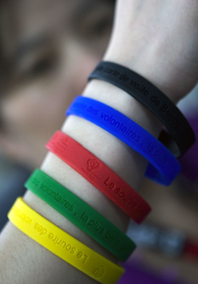在今天上午的北京奧運(yùn)會(huì)、殘奧會(huì)京外、境外賽會(huì)志愿者工作會(huì)議上,“微笑圈”法文國際版被發(fā)布,它由奧運(yùn)五環(huán)顏色組成,外側(cè)印有法文“Le sourire des volontaires,la plus belle carte de visite de Beijing”,據(jù)悉,該文字翻譯稱中文就是“志愿者的微笑是北京最好的名片”的,內(nèi)側(cè)印有唯一的編號(hào)。