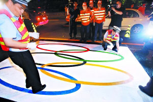 昨晚9點(diǎn),記者在三元橋下出京方向看到,一塊約6米見方的白色色塊被粘在車道上,施工人員用卡尺畫出奧運(yùn)五環(huán)標(biāo)志的輪廓,然后再鋪上黑、綠、紅等彩條。