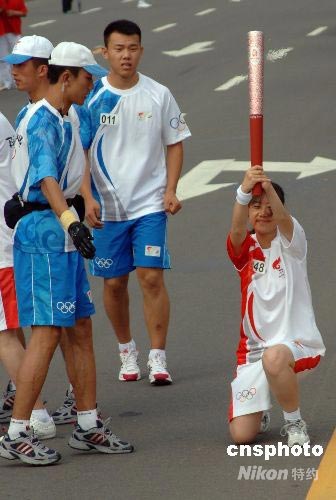 7月10日,奧運(yùn)火炬在內(nèi)蒙古赤峰傳遞,殘疾人火炬手麻微微跪迎奧運(yùn)圣火。 中新社發(fā) 廖攀 攝