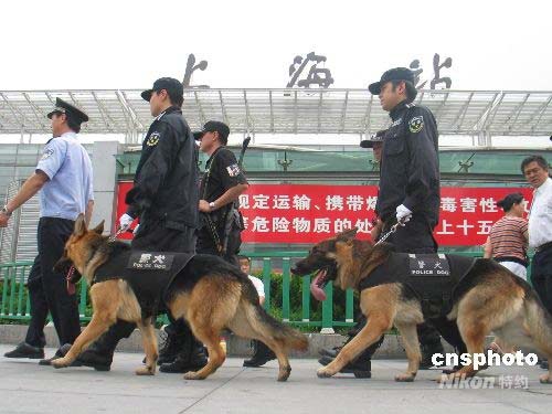為了提高鐵路安保等級(jí),確保奧運(yùn)期間鐵路運(yùn)輸和旅途安全,從7月24日起,鐵路警方抽調(diào)特警小分隊(duì)進(jìn)駐上海站廣場(chǎng),攜警犬晝夜巡邏。中新社發(fā) 陳煥聯(lián) 攝