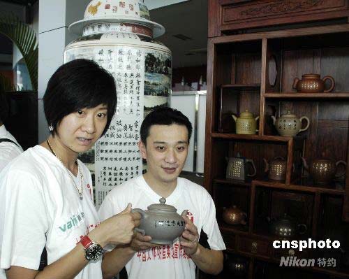 7月12日,“2008奧林匹克文化中國行”在海南三亞開幕。作為全國巡展的首站,三亞的展覽活動(dòng)歷時(shí)兩天,公開展示由226名書畫家共同創(chuàng)作的奧運(yùn)主題大型書畫作品《神州圣火傳遞圖》和《神州圣火傳遞頌》。作品全面描繪了113個(gè)火炬?zhèn)鬟f城市的風(fēng)土人情;顒(dòng)期間還展出奧運(yùn)文化優(yōu)秀作品“中華紫砂壺”和“盛世將軍瓶”。圖為1996年亞特蘭大奧運(yùn)會(huì)游泳冠軍樂靜宜(左)和2000年悉尼奧運(yùn)會(huì)跳水冠軍肖海亮(右),在“中華紫砂壺”和“盛世將軍瓶”前展示“中華紫砂壺”。中新社發(fā) 尹海明 攝