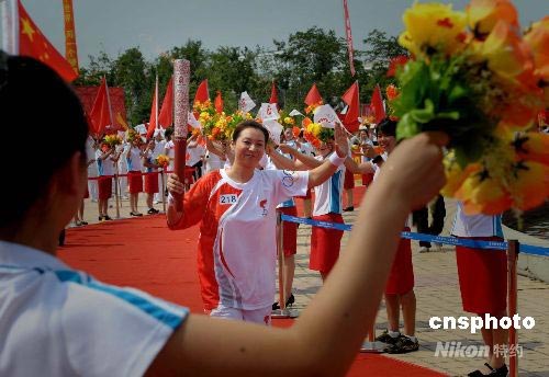 7月14日,奧運(yùn)火炬在吉林長(zhǎng)春傳遞。圖為長(zhǎng)春末棒火炬手速滑健將王春露跑向傳遞終點(diǎn)。中新社發(fā) 廖攀 攝