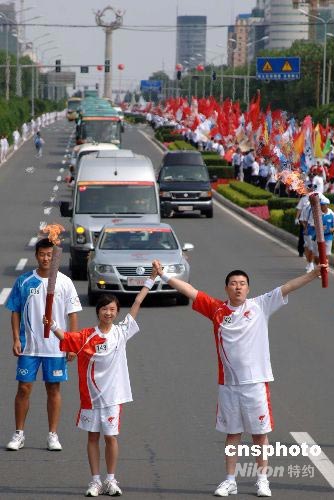 7月14日,奧運火炬在吉林長春傳遞。圖為火炬手東北師大附小學生袁萌(左)和火炬手王洪巖交接火炬。 中新社發(fā) 廖攀 攝