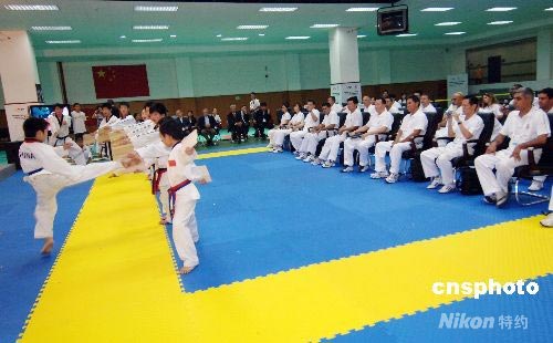 7月14日,29名將執(zhí)法北京奧運(yùn)會(huì)的裁判員聚集在北京什剎海體校跆拳道訓(xùn)練館,參加由世界跆拳道聯(lián)盟組織的奧運(yùn)前的“最后一課”。這也是世跆聯(lián)第一次在東道主國家舉辦奧運(yùn)前最后一次裁判培訓(xùn)班。圖為裁判員觀看什剎海體校跆拳道運(yùn)動(dòng)員表演。 中新社發(fā) 王東明 攝
