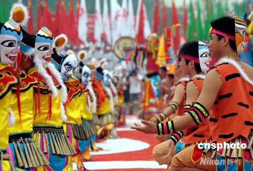 圖:滿族少年跳起“面具舞”迎接"祥云"